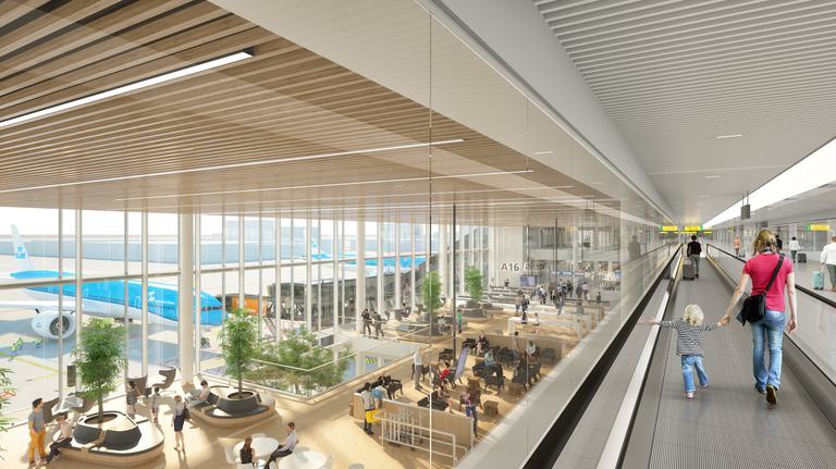 The architectural and interior design of the A-pier were made by cepezed and cepezedinterieur within the total engineering team of AECOM. The new pier is characterized by a high degree of spaciousness, an abundance of natural light and long sightlines. An ambitious sustainability and a rich diversity of pleasant sitting places and customer facilities also contribute to the pier's character.