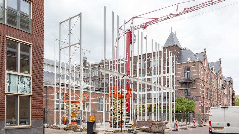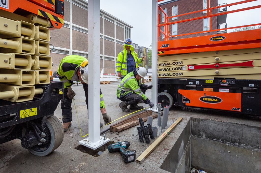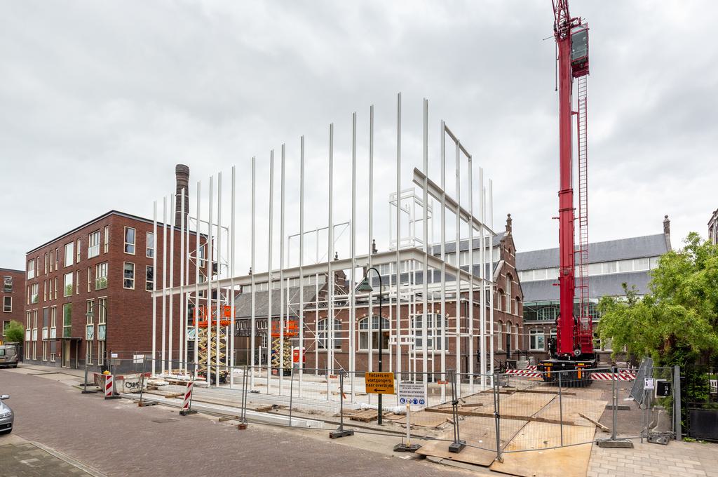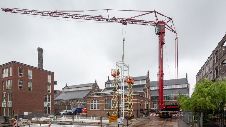 This morning, assembly of the steel construction of Building D(emountable) kicked off on the cepezed-complex in Delft. Due to its drastic prefabrication, it topped out within an hour. Part of the steel construction is the elevator shaft shown on the picture. It was delivered by truck as a whole, put in position with a crane and dry-mounted by means of bolts. This kit-of-parts construction method stems from cepezed’s design vision, which takes into account the manufacturability and efficient realization of buildings. According to plan, the placement of the main load-bearing structure including the steel stairs will be completed within three weeks.