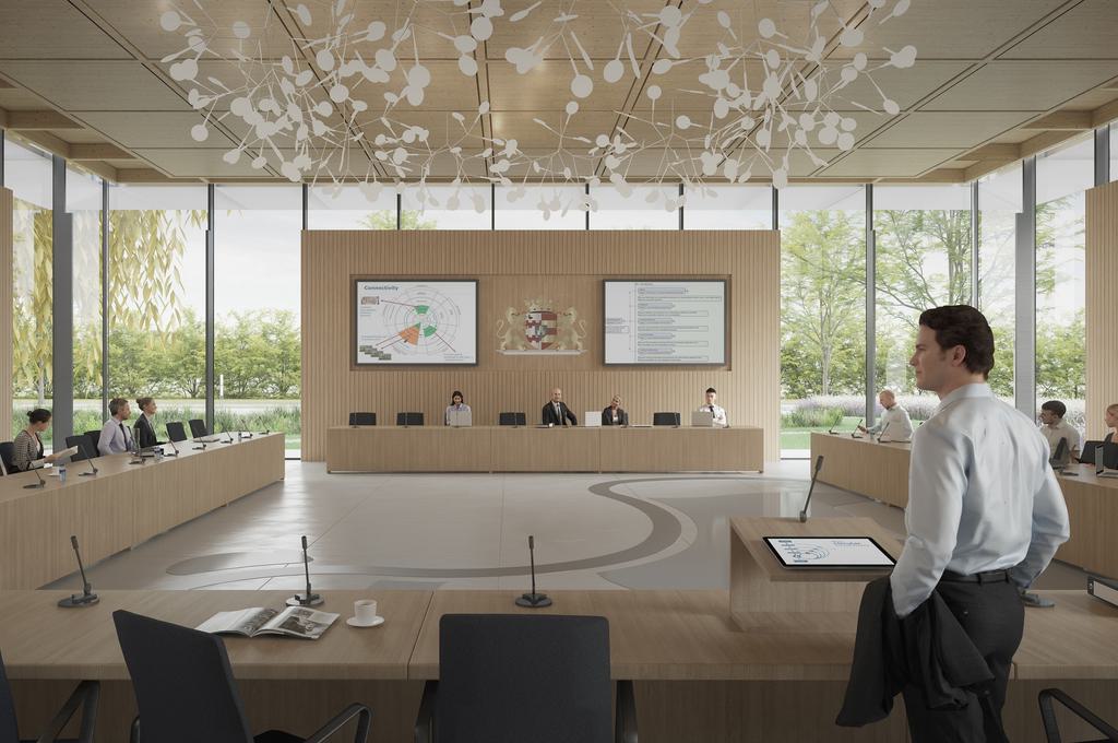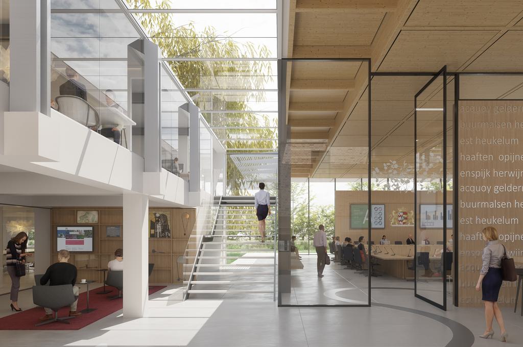A new, inviting pavilion with a striking wooden roof is partly positioned in front of the existing complex and contains the public entrance with counters, consultation rooms, waiting areas, break-outs and the multifunctional council chamber. This council chamber is flexible in use thus become a living room for the new municipality. Gatherings, events, concerts, lectures, and wedding ceremonies can easily be held next to council meetings.