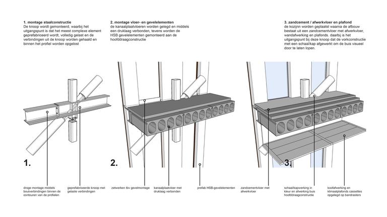The editors were positively surprised by the so-called building knot booklet: 'For the contractor, the architect and structural engineer made a building knot book, which provided insight into the design and the level of ambition. This contained detailed drawings, sketches of connections, proposals for the assembly sequence, component sizes, and examples of steel knots in other buildings designed by the designer(s). The starting point for the building knot booklet is that the most complicated part of the knot is welded 'clean' and prefabricated parts are bolted on site. 'Take the connection out of the knot,' the architect says.