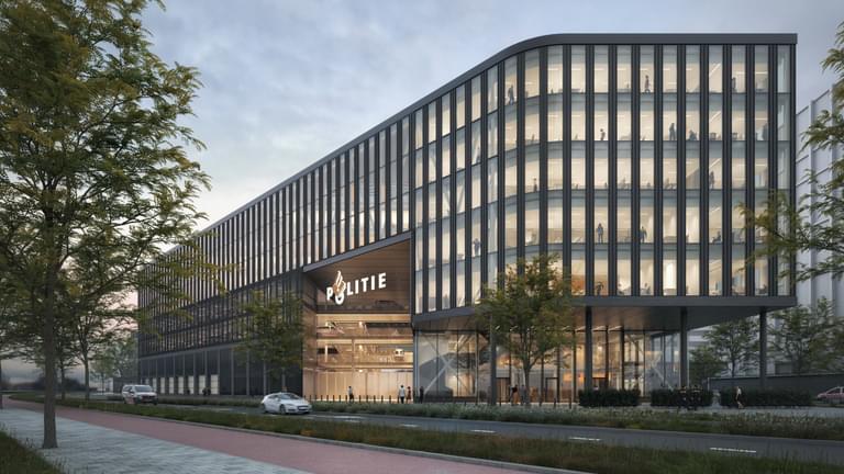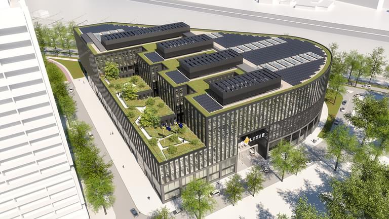 The Hague is getting a vast new police complex. It is composed of five 'fingers', with a shaft, or 'canyon', at right angles to them. Completion is scheduled for 2025. Construction is progressing steadily and the contours of the building are already clearly visible. The construction consists of prefabricated elements. The façade follows the boundary of the plot, which curves around on one side. In the remaining space between the floor fields and the façade are triangular vides.