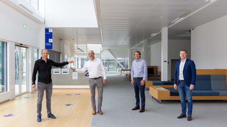 Picture handover of the key - from left to right: Ronald Rientjes (RVB), Menno Rubbens (cepezedprojects), Martijn Du Prie (Du Prie Bouw &