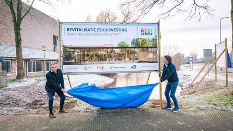 There is now a construction sign in front of the town hall. It shows what the future town hall will look like. Alderman Ed Goossens and director Bas Hommelink of WAM & Van Duren Bouw B.V. unveiled the sign on Wednesday. This was a symbolic kick-off to the collaboration. In April 2022, the contractor will start with the demolition. A year later, in 2023, the renovation and new construction will be completed.