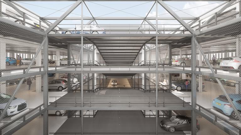 Dismantability also plays a role at the Wega.Punt garage on The Hague's Binckhorst. This garage is located in a former office building. The future-proofing here mainly lies in the possibility of exchanging the parking function for another function. The storey height remained unchanged and the ramps needed for the parking function were placed in the heart of the building, on the former courtyard. Due to their demountable nature, they can also be taken out of there. However, the parking space will certainly be needed in the coming years for the employees of the Police Headquarters nearby.