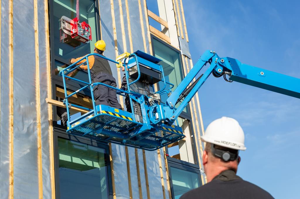 Just before the construction holiday, the façade elements of timber frame construction (HSB) were installed in record time. The roof covering is on top and the skylights of the atrium have also been installed. The aluminum window frames are currently being mounted. That is also proceeding swiftly, because they are hoisted as elements complete with glazing.