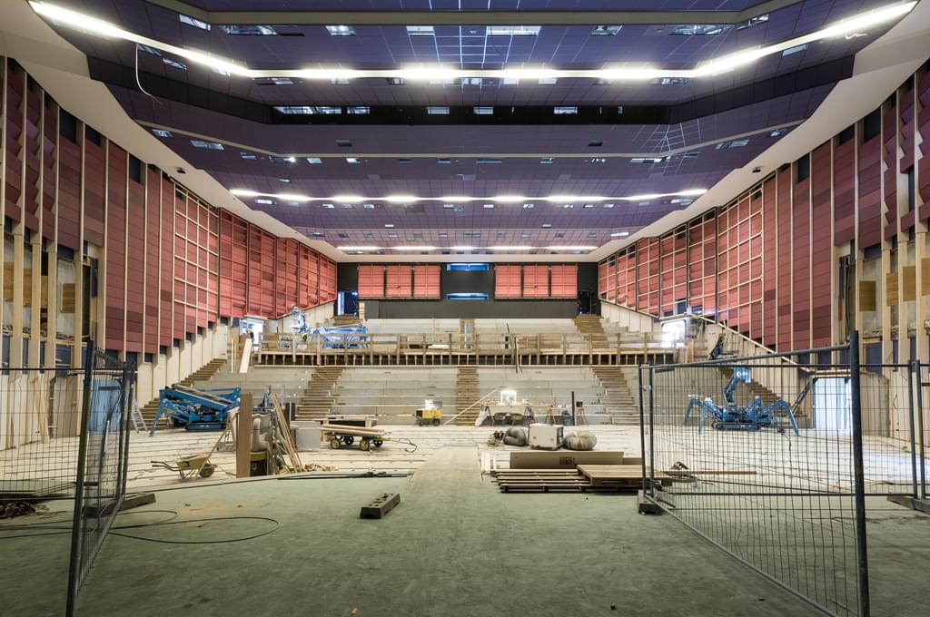 Inside is where the breakthrough between new and existing buildings has been made. And where the transformation of the auditorium has started. Of the existing construction adjacent to the new building, parts have been removed. Floor and façade sections have been removed, but new floors and walkways have also been made. This makes it possible to walk all the way around the auditorium now, while the spatial end result is quite visible already.