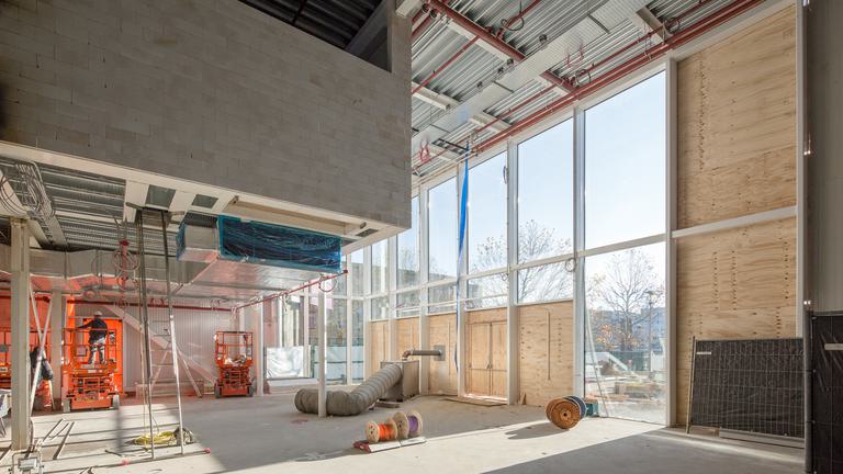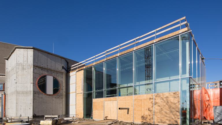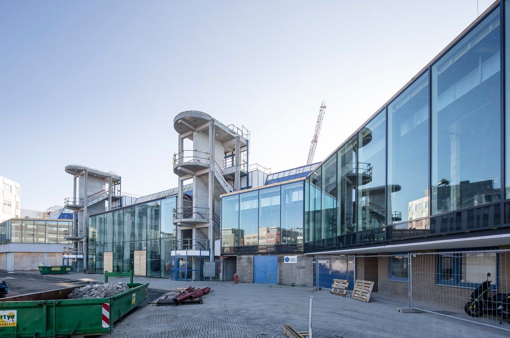For a smooth, spatial connection of the new construction to the adjacent Forumplein (Forum Square), the square and the underlying parking garage were somewhat reduced and aligned. To this end, the existing deck was partially removed, soil was excavated and a retaining wall was installed. The existing entrance on the Forumplein has also been demolished. The steel structure for a new one has already been installed.