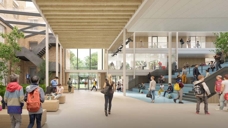 The characteristic, closed facades will be partly preserved in the new Van Maerlantlyceum, but large glass facades will allow more daylight to enter. A new pavilion at the centre will offer a view of the park and the Dommel river flowing by. This will house classrooms for creative and technical subjects. Instead of one large atrium, there will be spaces for quiet study and areas for social breaks.