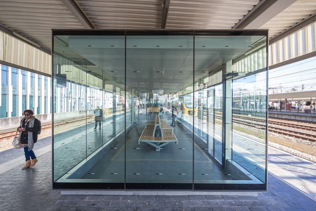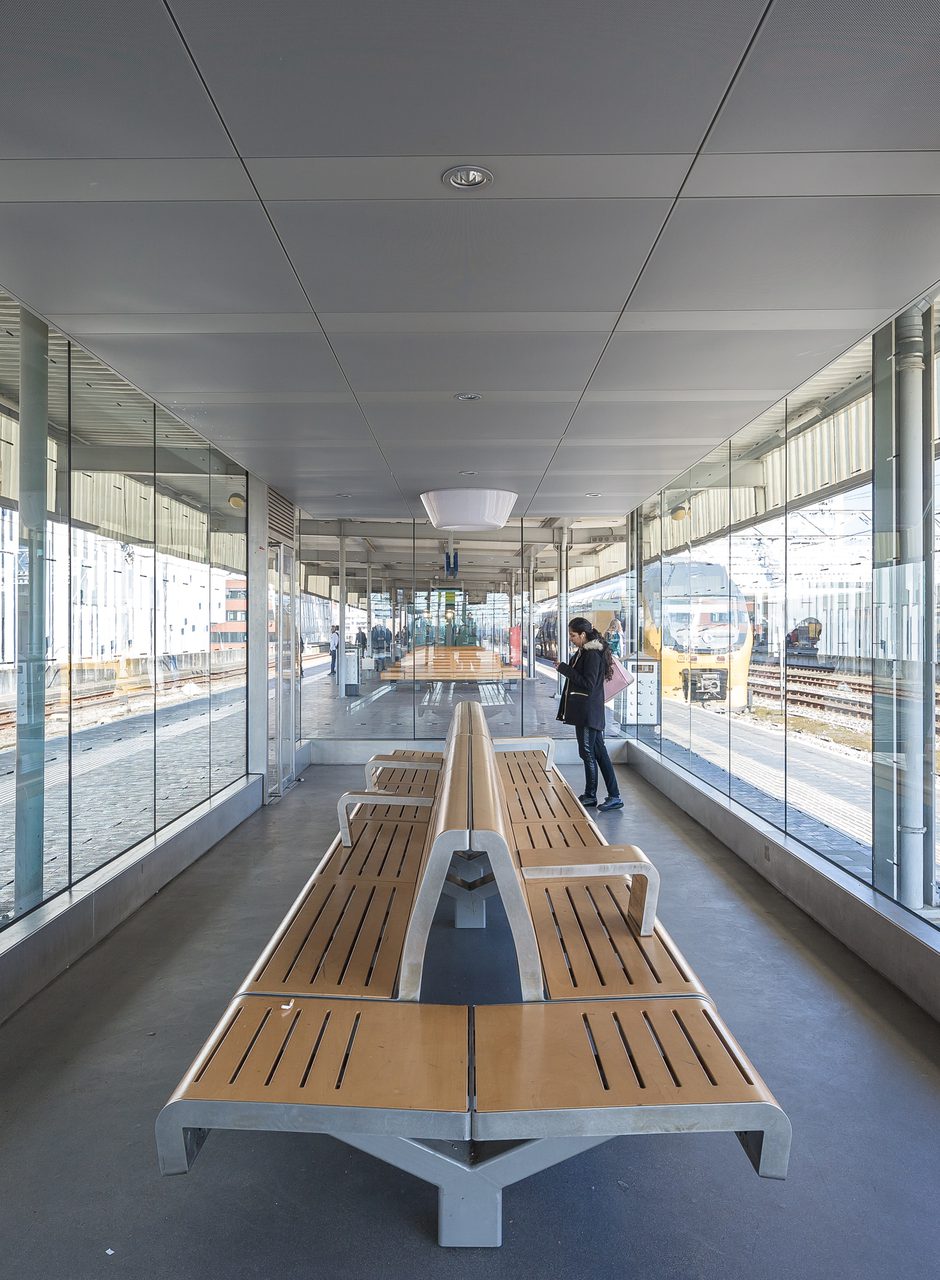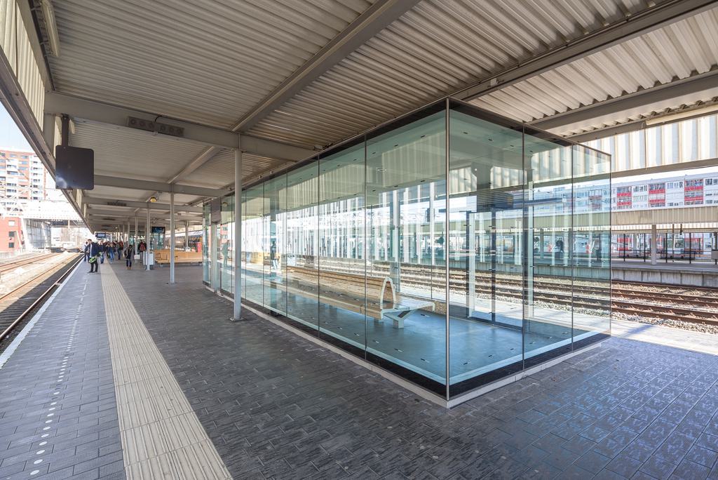 The overall platforms layout at a variety of train stations were outdated, so ProRail issued a tender. Public-space design office Blom & Moors was awarded the assignment. For them, cepezed developed a waiting room, kiosk and glass windbreak, which also doubles as a leaning element.