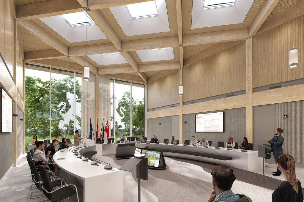 ‘We zetten hiermee een belangrijke stap richting een toekomstbestendig en duurzaam gemeentehuis, dat beter past bij de dienstverlening naar de inwoners en het nieuwe werken van onze organisatie’, zegt wethouder Karl Maier bij het ondertekenen van de aannemersovereenkomsten. Het nieuwe gemeentehuis heeft een sfeervolle houten draagconstructie. Het wordt een energieneutraal gebouw met gevels van glas en bamboe onder een opvallend brede luifel.