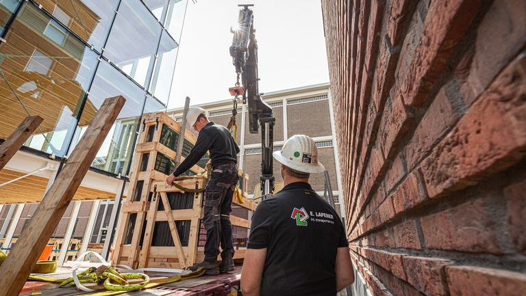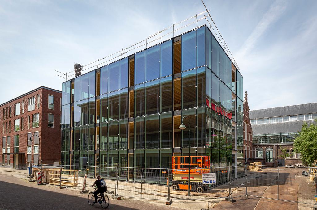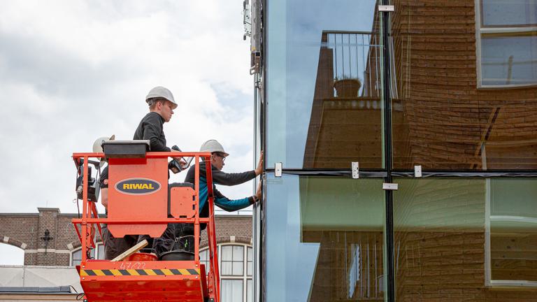 Deze week is gestart met het dichten van de glazen vliesgevel. De glaspanelen lopen van kolom tot kolom en zijn met ruim 3,15 meter verdiepingshoog. Bouwdeel D(emontabel) wordt zo zeer transparant en krijgt een sterke relatie met zijn omgeving. Het glas is voorzien van een zonwerende coating om warmtetoetreding te beperken. Handmatig te openen panelen maken het straks mogelijk natuurlijk te ventileren. Over drie weken is het gebouw wind- en waterdicht.