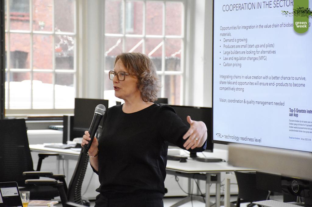 Chantal noemt in haar presentatie twee belangrijke ontwikkelingen die de bouwindustrie de komende tijd drastisch kunnen veranderen. Ten eerste al het nieuwe biobased bouwmateriaal dat recent is ontwikkeld. Op de Floriade waren deze zomer voorbeelden te zien van bouwmateriaal van onder meer paprika, zeewier en het aloude stro. Zij voorziet dat het binnen een paar jaar mogelijk zal zijn om alle nieuwe kantoren en woningen met biobased materiaal te bouwen. Een andere belangrijke ontwikkeling is de groeiende woningbouwopgave, die met het oog op de CO2-uitstoot volgens Chantal niet anders opgelost kan worden dan binnenstedelijk en met biobased materiaal. Voorafgaand aan haar komst legden we Chantal drie vragen voor.