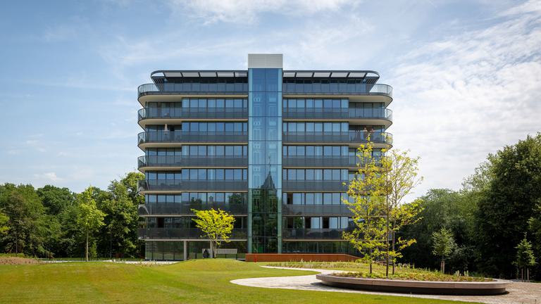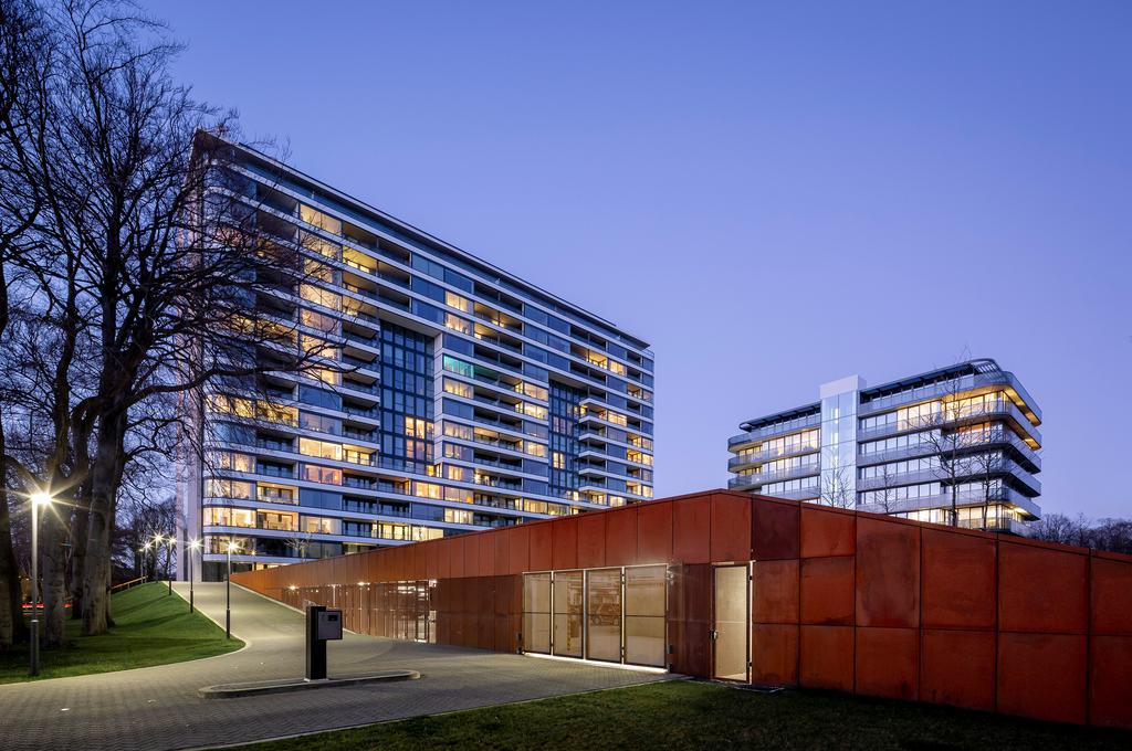 ‘Living in the park, enjoying the city’ staat op de toegangspas voor de privéparkeergarage van het luxe appartementencomplex Park Hoog Oostduin in Den Haag. cepezed transformeerde voor de woningen een voormalig Shell-kantoor uit de jaren ’60 dat oorspronkelijk werd ontworpen door H.E. Oud, zoon van de bekende modernistische architect J.J.P. Oud. Afgelopen periode betrokken de nieuwe bewoners hun huur- en koopappartementen, die helemaal zijn opgenomen in het groen van landgoed Oostduin-Arendsdorp.