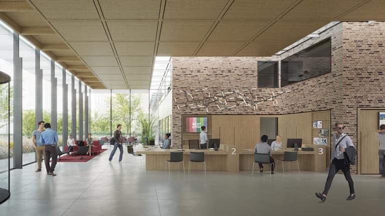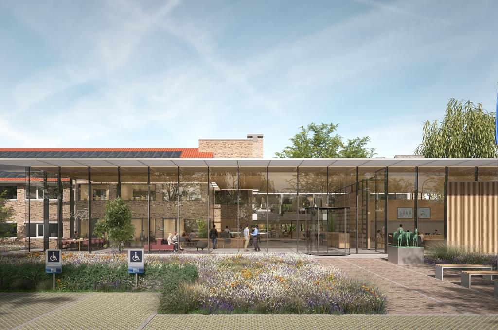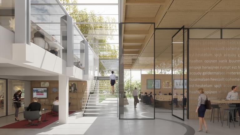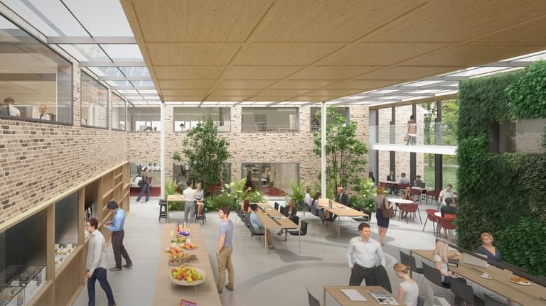 Het bestaande gebouw krijgt een rijke diversiteit aan gezonde, comfortabele werkplekken. In het hart van het werkgebied wordt een bestaande patio overkapt met hout en glas en omgevormd tot ontmoetingsplein met aanlandwerkplekken, een koffiebar, een keuken en veel groen.
