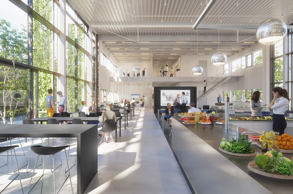 De uitbreiding is min of meer een kopie van het bestaande kantoor: een opgetilde ‘doos’ met een overspanning van 16 meter, waardoor de verdiepingsvloeren flexibel indeelbaar zijn. Compleet nieuw is het dubbelhoge, daglichtrijke atrium, precies tussen de 2 werkvleugels in. Deze ruimte is bedoeld als entree en voor lunch, overleg, presentaties en andere feestelijke gelegenheden. Directeur Hoeksema: ‘Het is fijn dat we daar straks met zijn allen kunnen zitten, daarvoor was de hal in het bestaande gebouw te klein geworden.’