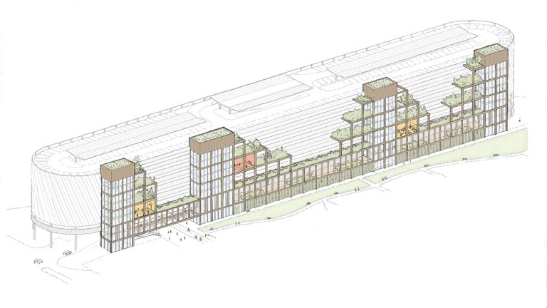 De toevoeging ‘XL’ voor de hub in Utrecht is niet voor niets gekozen: deze hub telt acht verdiepingen en is 250 meter lang. Hij komt in Papendorp te staan, op de grens van een bestaand bedrijvengebied en een toekomstige woonbuurt. Aan de zijde van de woningen wordt de gevel visueel opgebroken door er een getrapt, modulair houten frame tegenaan te plaatsen. Drie gevels van MHXL zijn halfopen, maar bij het frame is de gevel dicht. Zo kan de hub ook functioneren als een geluidsbuffer voor de woonbuurt.