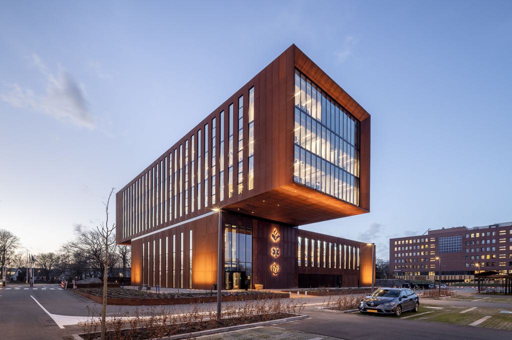 De MK ON in Apeldoorn heeft een stoere gevel van cortenstaal en opvallende overstekken. In de laagbouw zit het ‘command and control centre’, waar de telefoontjes binnenkomen en worden verwerkt. De hoogbouw, haaks daarop, is bedoeld voor kantoorfuncties en overleg. Onder een van de overstekken bevindt zich de entree. De indrukwekkende constructie van het gebouw is binnen grotendeels zichtbaar.