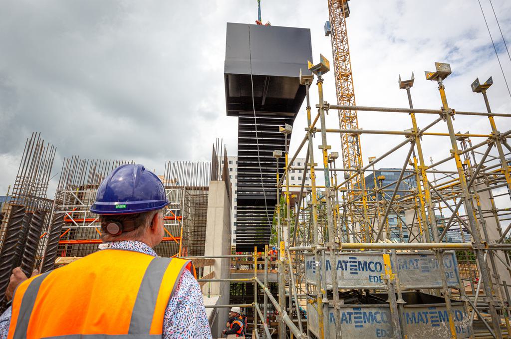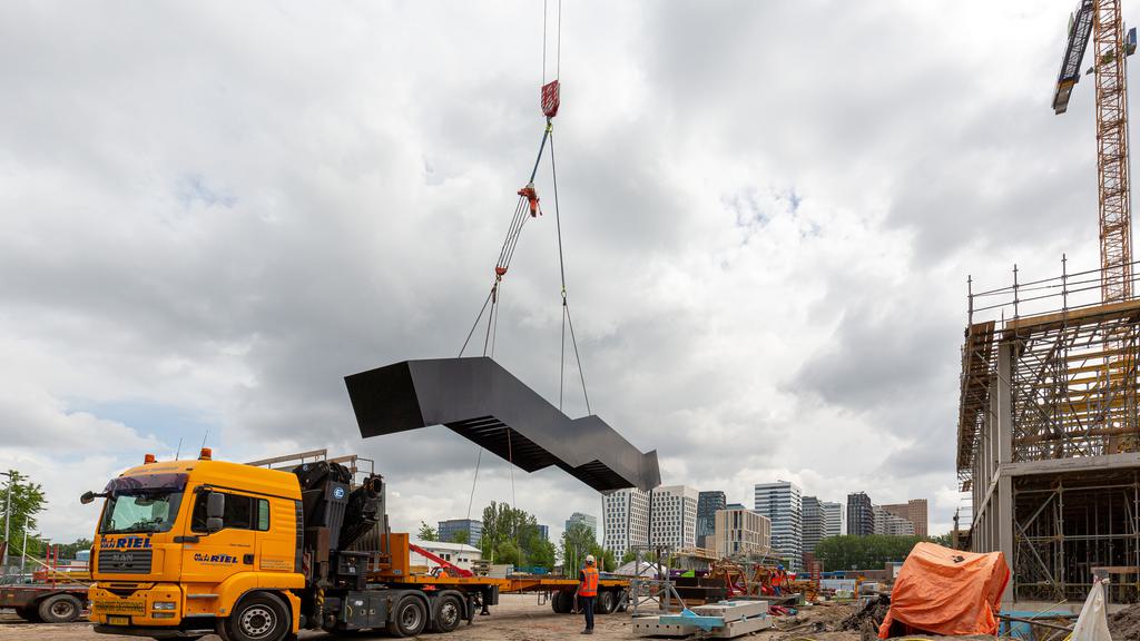 De uitvoering van het nieuwe onderzoeksgebouw voor de Vrije Universiteit Amsterdam (VU) is weer een belangrijke stap verder. Vorige week werd de eerste van twee grote stalen trappen in het centrale atrium geplaatst. Het inhijsen van de ruim 10 ton wegende trap was precisiewerk. Dankzij een goede voorbereiding was de klus in een uur geklaard.