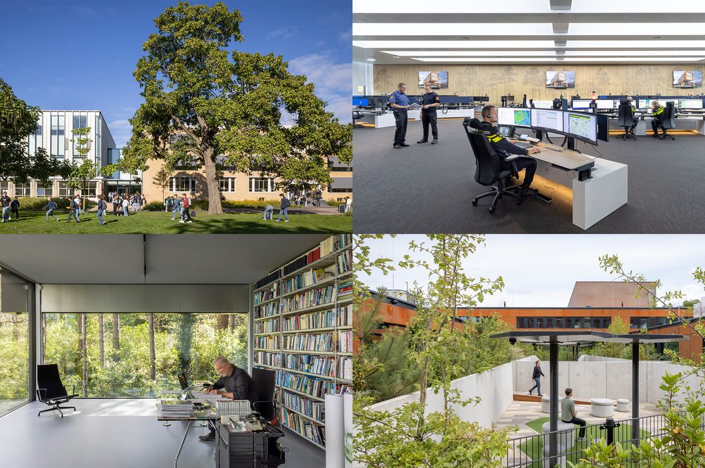 In november wordt bekend gemaakt wie de Apeldoornse Architectuurprijs en de Haagse Berlagevlag winnen. Met het ontwerp voor de meldkamer realiseerden we ondanks de technische installaties die bij een meldkamer komen kijken, een rustig interieur voor 24/7-werksituatie, in een robuuste schil van cortenstaal. Het zorgcentrum van de PI Haaglanden is een geslaagde pilot voor stikstofarm bouwen en een voorbeeld van de ‘humane detentie’ die de Dienst Justitiele Instellingen voorstaat. Grote ramen zonder tralies bieden zicht op duinvegetatie en er is in het gebouw veel hout toegepast, zelfs voor de constructie.