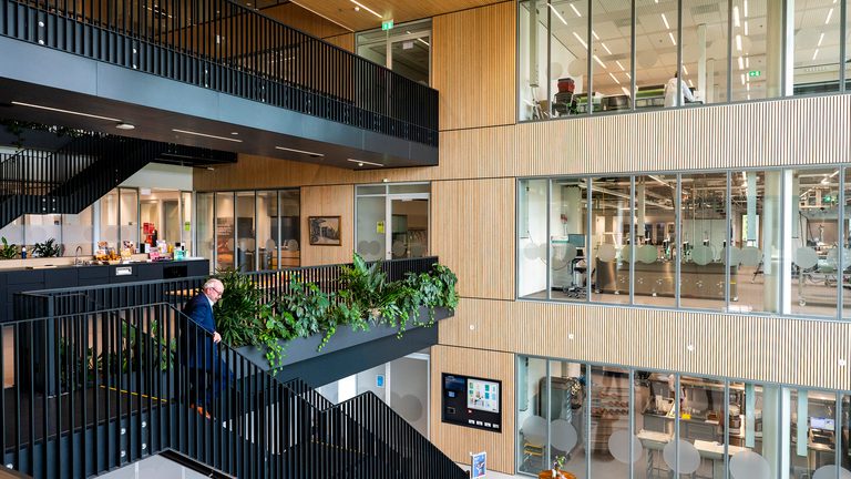 De gemeenschappelijke ruimtes zijn zorgvuldig vormgegeven. Daglicht valt tot diep in het gebouw en vrijwel overal is er zicht op de campus buiten. Trappen zijn opgevat als verblijfsplek en in deze gemeenschappelijke zone zorgen planten, hout en ruw geweven stoffen voor een warme sfeer – een resultaat dat goed laat zien wat de meerwaarde is van de nauwe samenwerking tussen cepezed en cepezedinterieur. Werkplekken zijn transparant en tegelijkertijd geborgen en glazen binnenwanden bieden zicht op wat er in de labs gebeurt. Heel anders dus dan de dsm-gistfabriek van voorheen, al draait het in het Van Marken Food Innovation Center nog steeds in grote mate om gist.