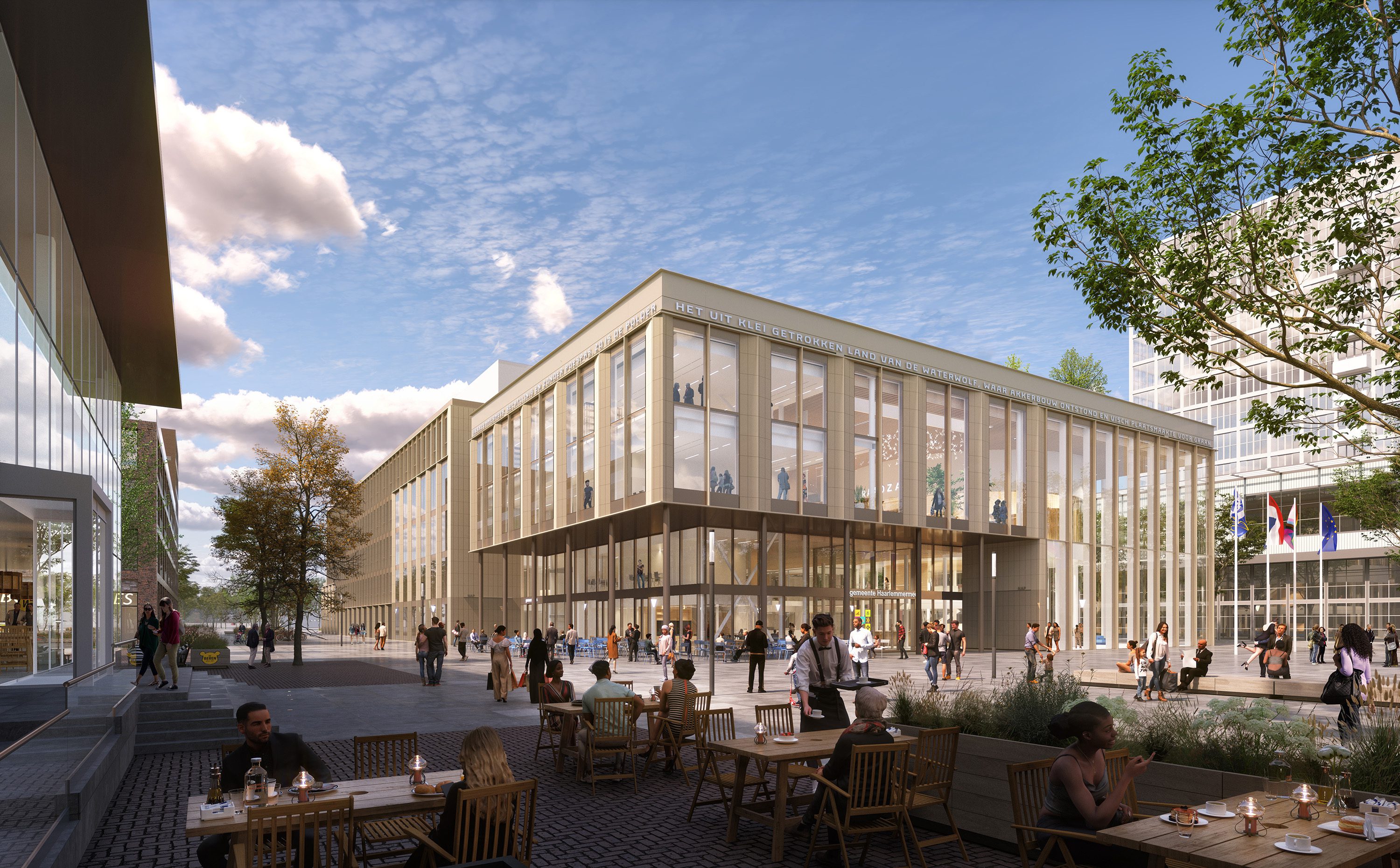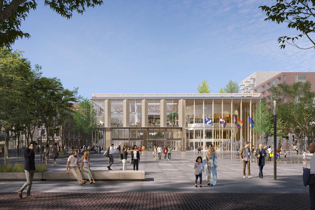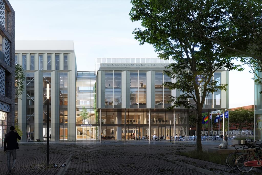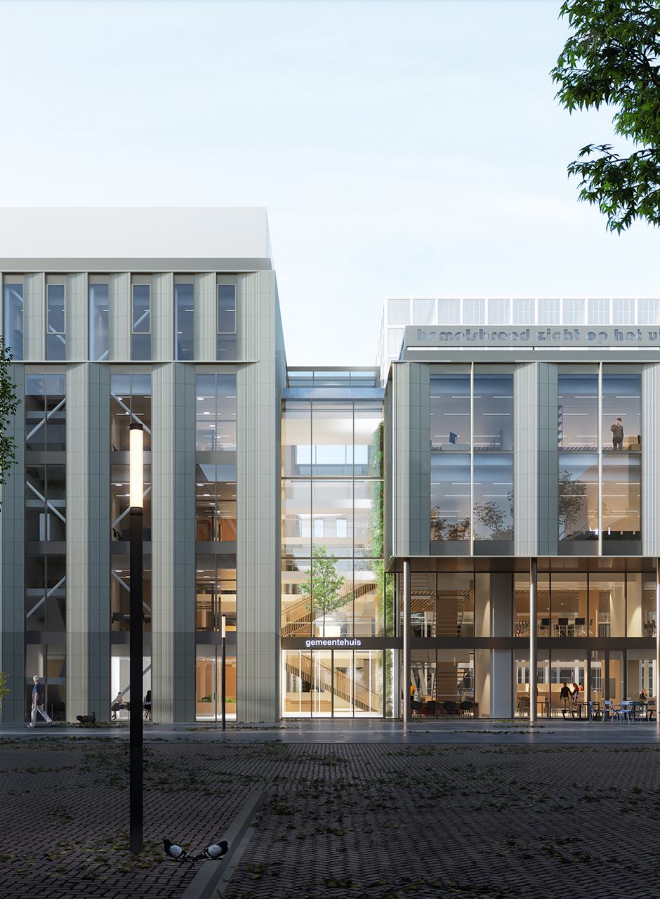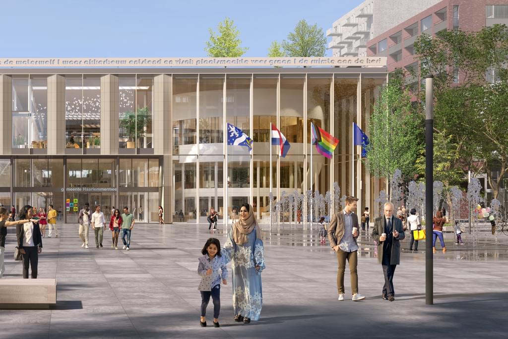 Het Raadhuisplein in Hoofddorp wordt compleet heringericht en ook de pleinwand verandert. Het nieuwe gemeentehuis komt op de plek van het oude, uit 1977. In de nieuwbouw staan duurzaamheid en laagdrempeligheid voorop, voor zowel medewerkers als inwoners. Een ronde raadszaal herinnert aan het meest opvallende aspect van het oude gebouw. De dakramen en het vele glas in de gevel zorgen voor een overzichtelijk en daglichtrijk interieur. De dichte geveldelen worden bekleed met zachtgele, keramische elementen, die zijn ingebed in panelen van geanodiseerd aluminium.