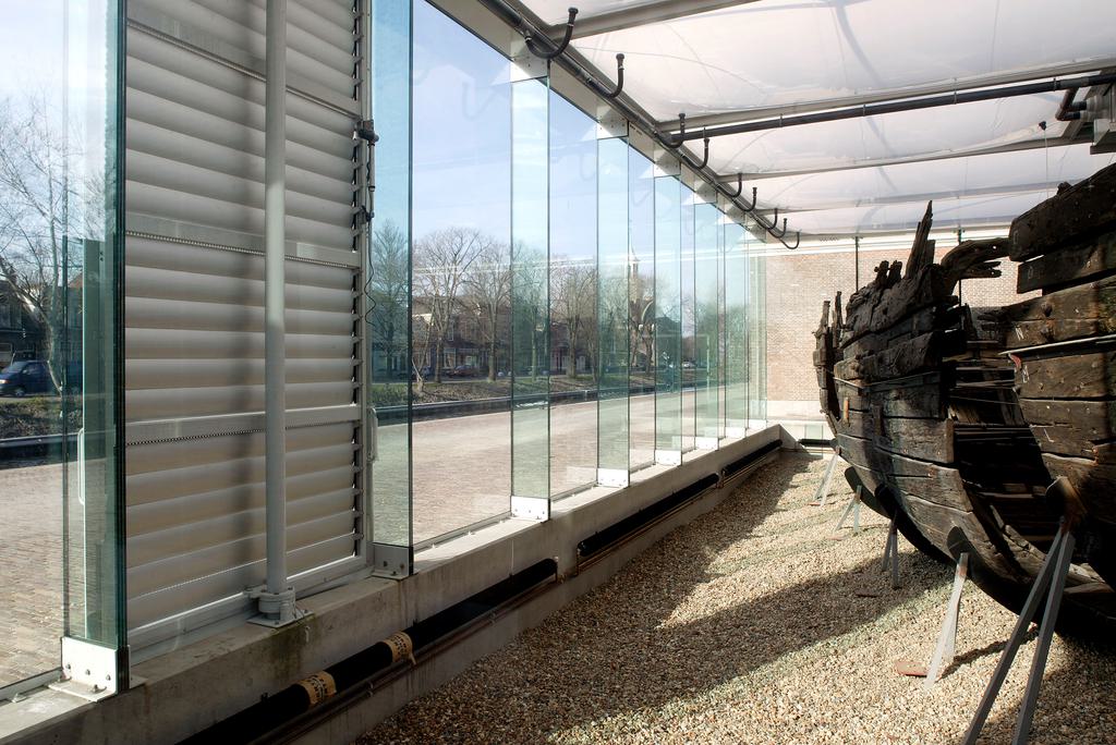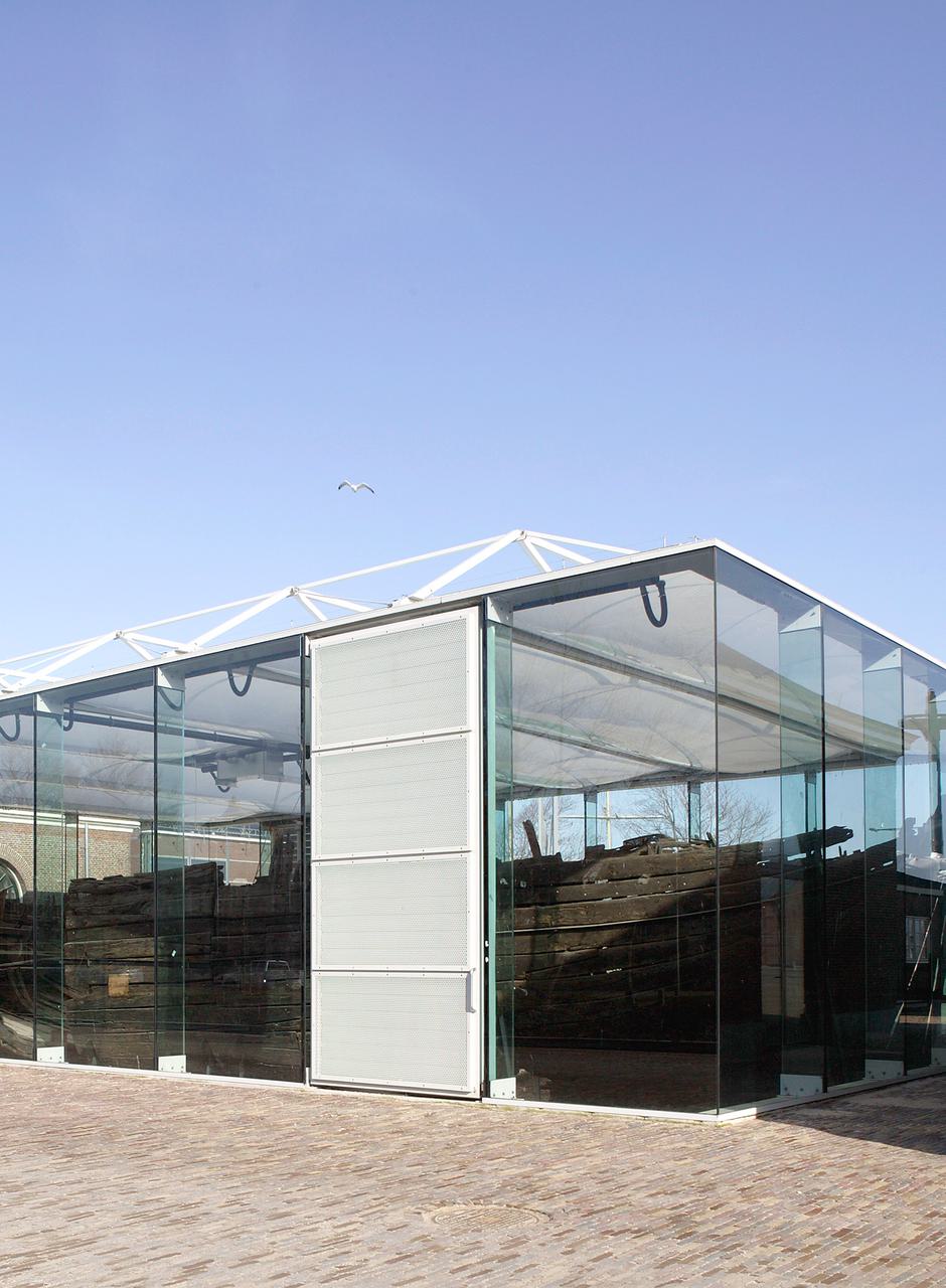 Voor op de voormalige Rijkswerf Willemsoord in Den Helder ontwierpen we een tentoonstellingsvitrine voor een 17e-eeuws scheepswrak van het type Pinas. Het paviljoen ligt tussen twee panden uit 1825 en is geheel opgetrokken uit glas. In het donker wordt het verlicht, waardoor het schip dag en nacht van alle kanten te bezichtigen is.